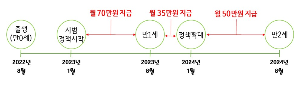 내년 2024년부터는 정식으로 정책이 확대되어 만0세 아동은 월 100만원, 만1세 아동은 월 50만원을 받게됩니다.